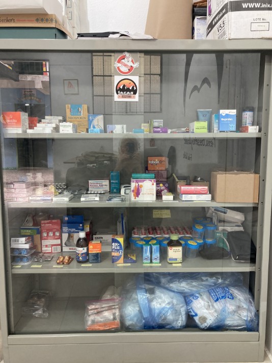 Our in clinic medicine cabinet slowly growing, thanks to donations.